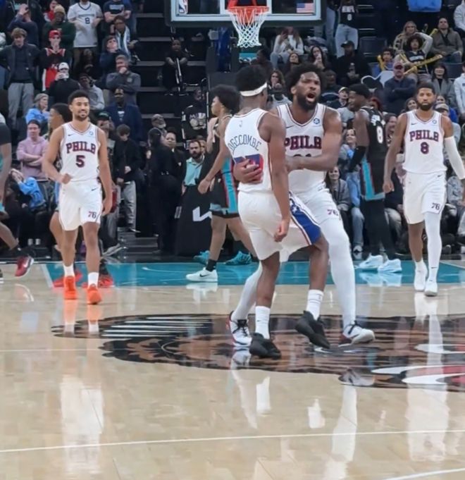 埃奇庫姆完成這個準(zhǔn)絕殺后,恩比德興奮無比沖上來擁抱這位小兄弟,要知道埃奇庫姆才20歲,這位1.93米的后衛(wèi)真有答案風(fēng)采。
