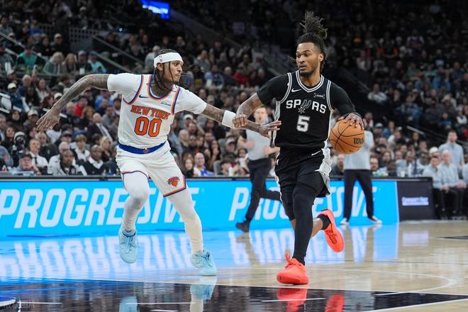 易邊再戰(zhàn),巴恩斯的上籃為馬刺吹響追分號角,將分差縮小至8分。但尼克斯迅速回敬11-5的攻勢,將領(lǐng)先優(yōu)勢重新擴大到14分。此時文班亞馬持續(xù)輸出火力,帶領(lǐng)馬刺多點開花,憑借一波16-2的窒息式反擊實現(xiàn)86-86的平分。此后賽場進入白熱化爭奪,馬刺連得5分反超比分,克拉克森的三分與布倫森的連續(xù)得分(兩罰全中+兩記三分獨得8分)又讓尼克斯重掌主動權(quán),三節(jié)戰(zhàn)罷馬刺以93-102仍落后9分。