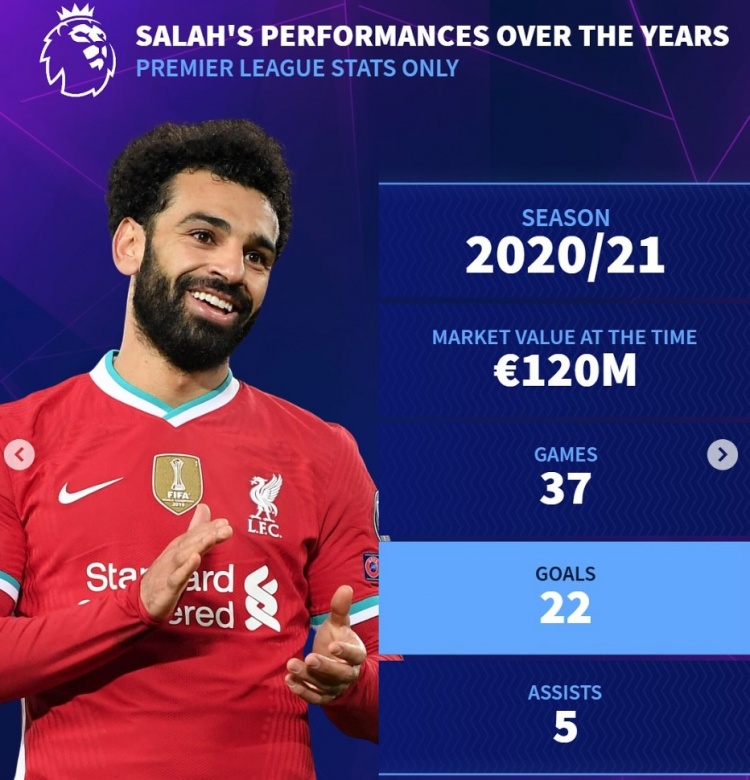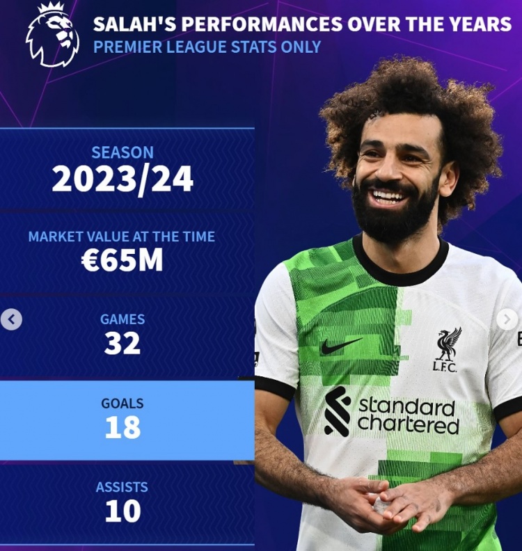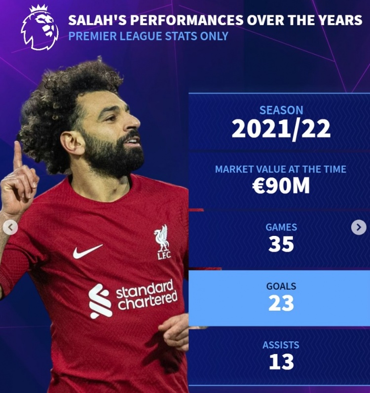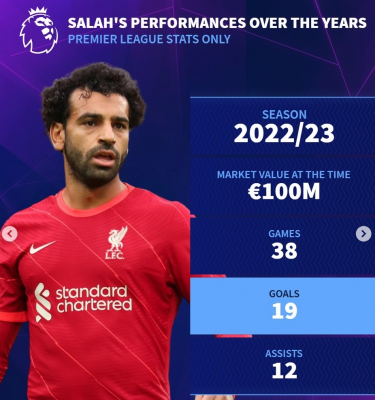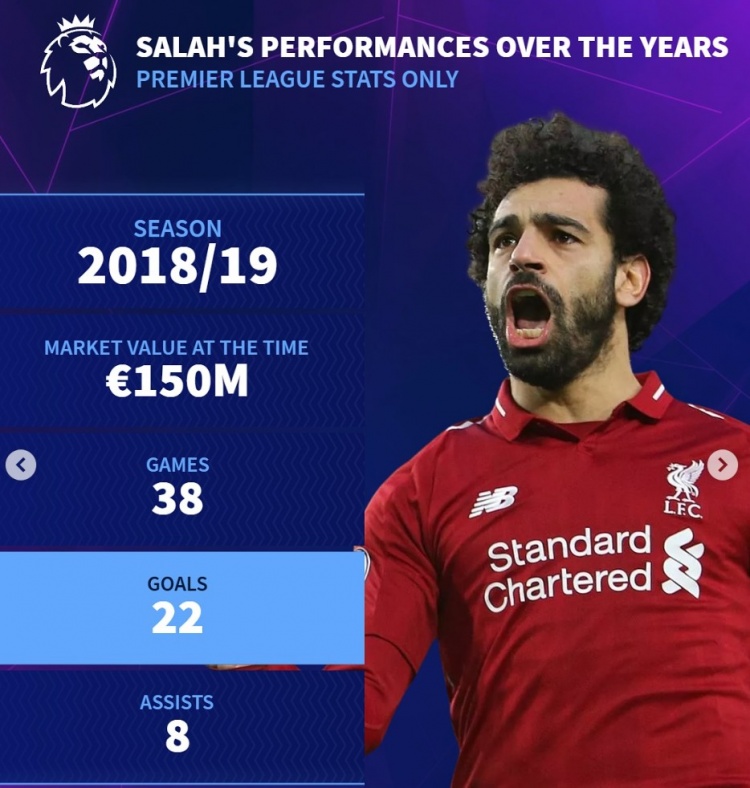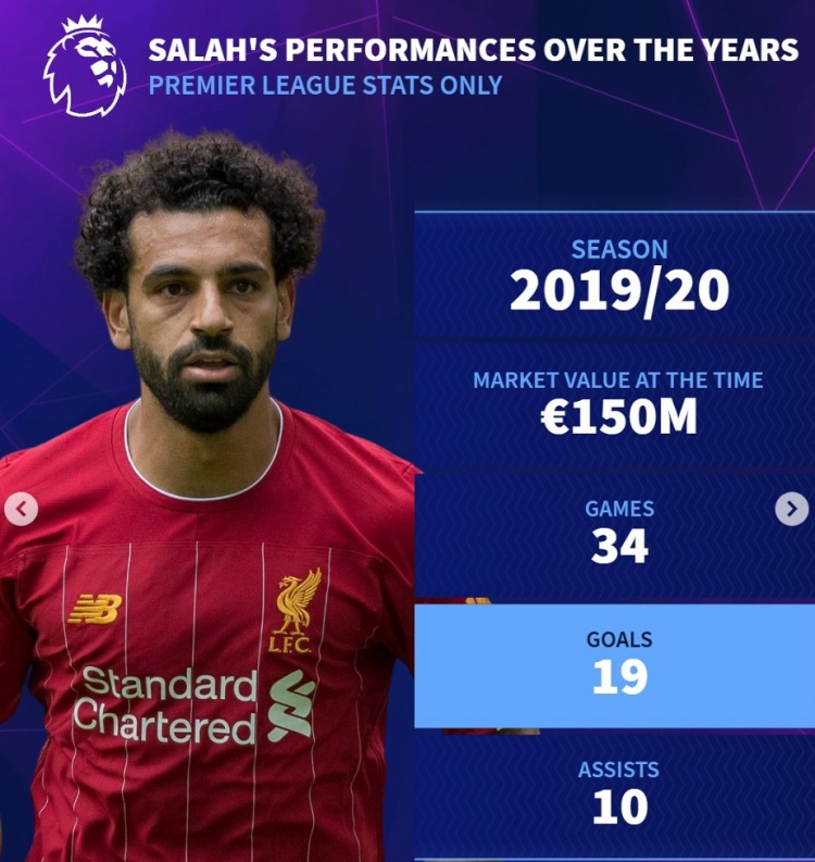 曇花不?。〉罗D(zhuǎn)列薩拉赫歷年英超數(shù)據(jù):身價(jià)最高1.5億歐元