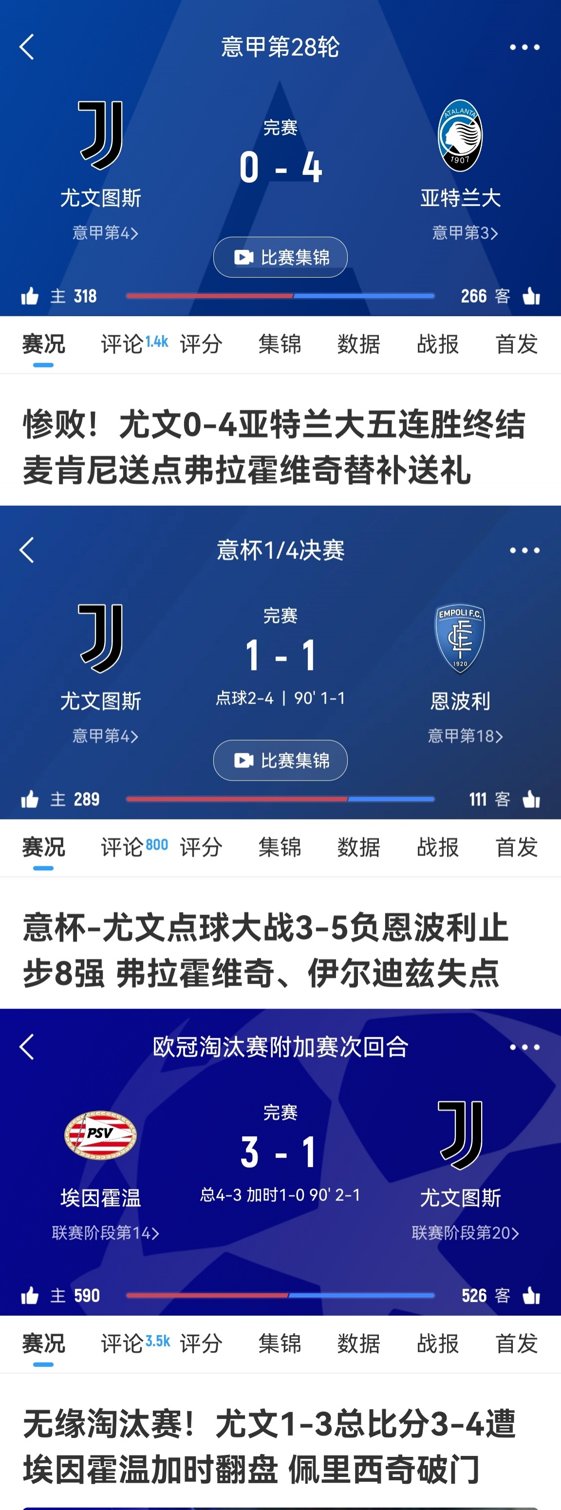 意杯賽場(chǎng),尤文1/4決賽點(diǎn)球大戰(zhàn)不敵保級(jí)隊(duì)恩波利。歐冠賽場(chǎng),球隊(duì)1比3被荷甲第2埃因霍溫加時(shí)賽翻盤(pán)。