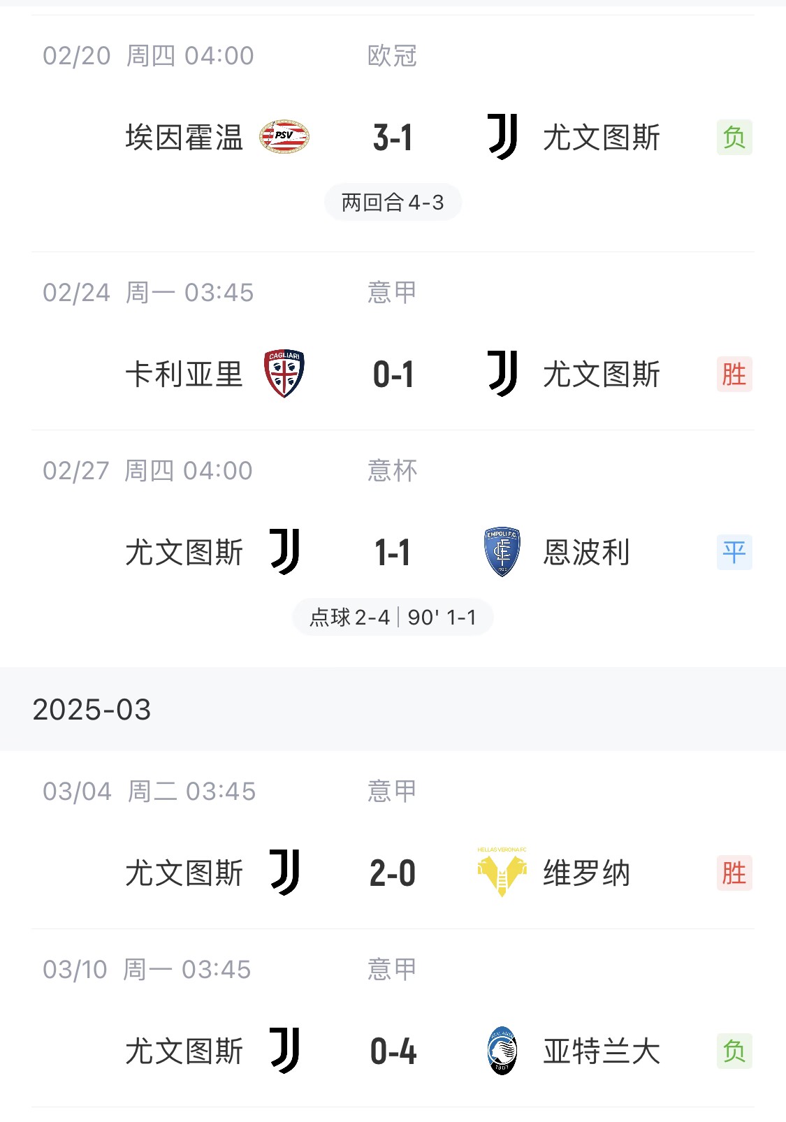 然而近一個(gè)月,尤文相繼遭遇歐冠附加賽失利,意杯出局:歐冠附加賽兩回合3-4不敵埃因霍溫,無緣淘汰賽;意大利杯則是點(diǎn)球出局,不敵降級區(qū)的恩波利。