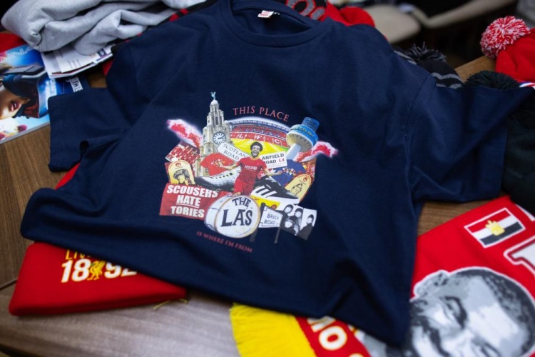 在距離利物浦主場安菲爾德只有5分鐘步行路程的一家商店里,你可以看到當?shù)卣诔鍪垡患?0鎊的T恤,上面印有目前利物浦這座城市的標志:樂隊披頭士和The La's、地標性建筑皇家利物大廈和利物浦電臺城塔,以及薩拉赫。