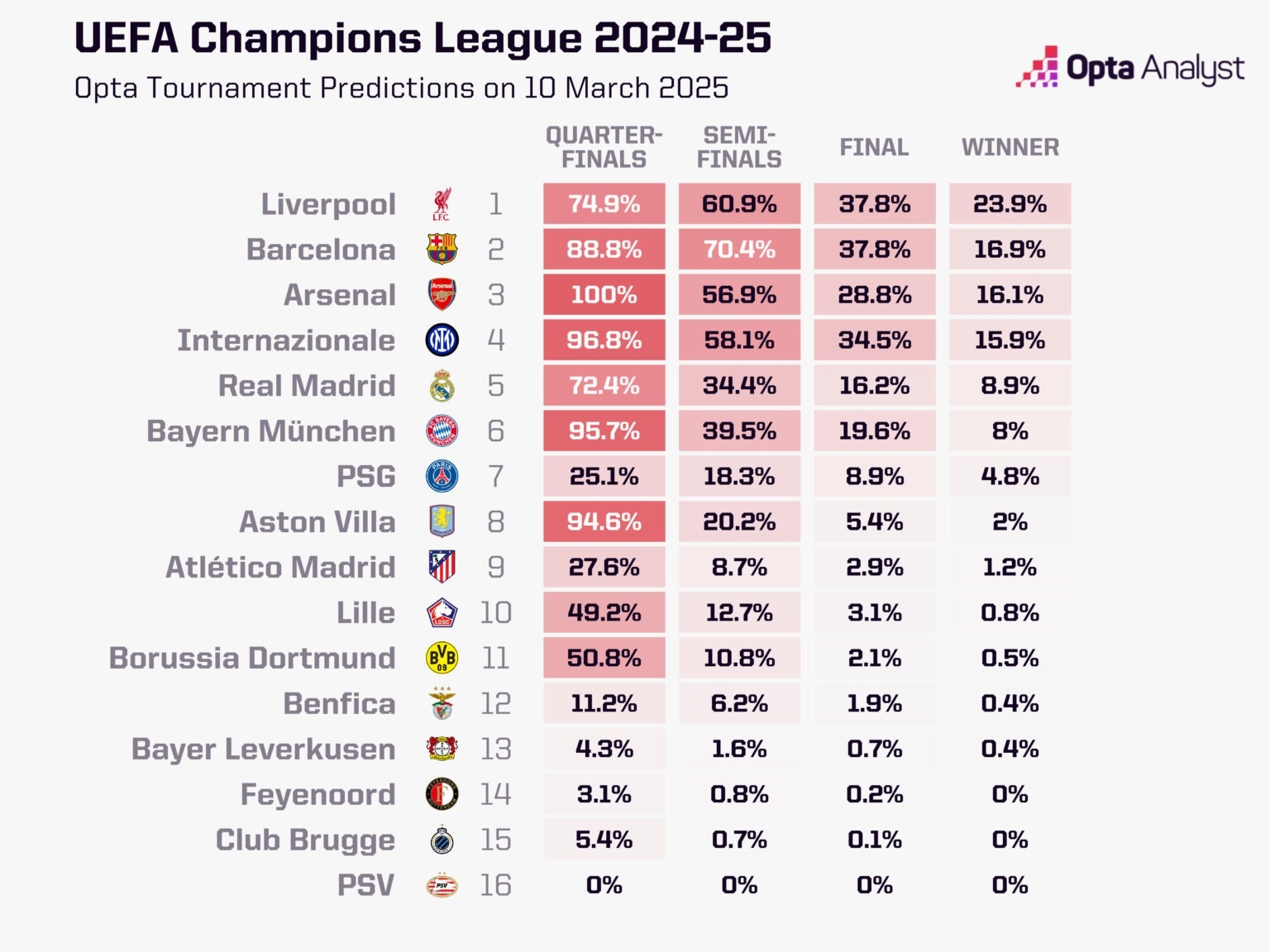 角逐8強!歐冠次回合勝率預測:利物浦高于巴黎,馬競稍勝皇馬