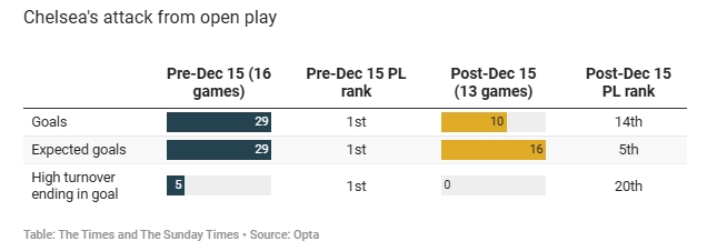 另外,切爾西在英超前16輪中利用高位失誤打進(jìn)了5粒進(jìn)球排名第一,而最近13輪比賽該項(xiàng)數(shù)據(jù)為0。