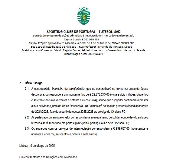 埃蘇戈轉(zhuǎn)會(huì)費(fèi)為22272275.00歐元(約2227萬歐),將在本賽季結(jié)束時(shí)支付。球員將繼續(xù)為拉斯帕爾馬斯效力至2024/2025賽季結(jié)束,并從2025/2026賽季開始為切爾西效力。