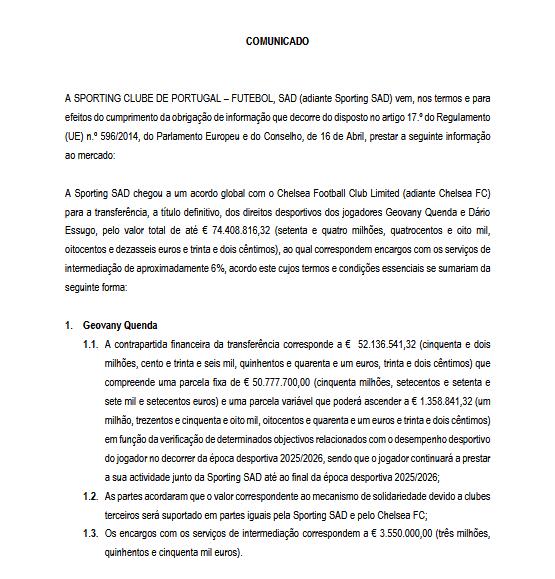 葡體與切爾西就球員昆達(dá)和埃蘇戈的永久轉(zhuǎn)會(huì)達(dá)成全面協(xié)議,總金額為74408816.32歐元(約7441萬歐),其中包括約6%的中介服務(wù)費(fèi)用。