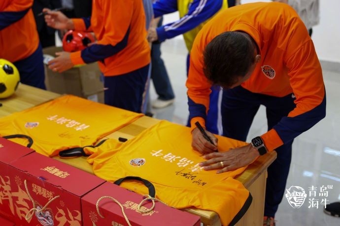 初春的青島充滿暖意,海牛俱樂部球員們的到來更是給孩子們帶來了歡聲笑語。俱樂部為兒童福利院捐贈了牛奶、堅果、足球及其他生活用品,并為兒童福利院送上簽名足球、球衣、專屬球衣等紀念禮品。