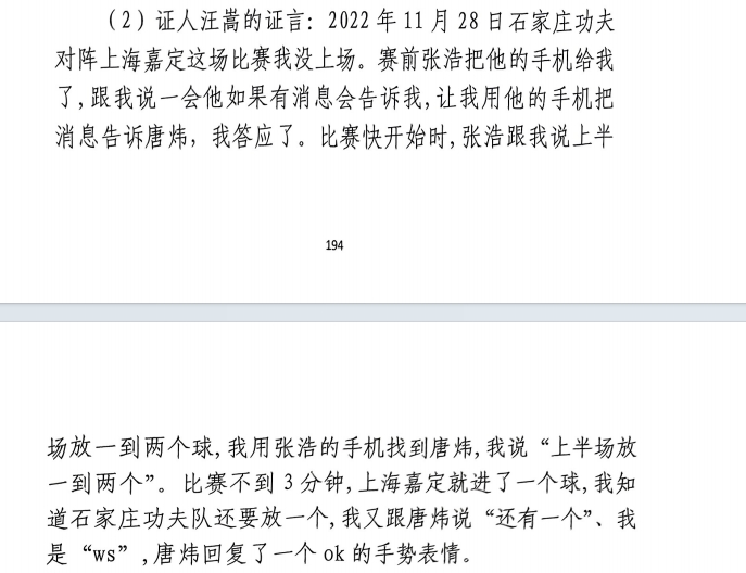 汪嵩證言:2022年11月28日石家莊功夫?qū)﹃嚿虾<味ㄟ@場(chǎng)比賽我沒(méi)上場(chǎng)。賽前張浩把他的手機(jī)給我了,跟我說(shuō)一會(huì)他如果有消息會(huì)告訴我,讓我用他的手機(jī)把消息告訴唐煒,我答應(yīng)了。比賽快開(kāi)始時(shí),張浩跟我說(shuō)上半場(chǎng)放一到兩個(gè)球,我用張浩的手機(jī)找到唐煒,我說(shuō)“上半場(chǎng)放一到兩個(gè)”。比賽不到3分鐘,上海嘉定就進(jìn)了一個(gè)球,我知道石家莊功夫隊(duì)還要放一個(gè),我又跟唐煒說(shuō)“還有一個(gè)”,我是“ws”,唐煒回復(fù)了一個(gè)ok的手勢(shì)表情。