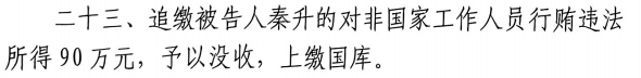 二十三、追繳被告人秦升的對(duì)非國(guó)家工作人員行賄違法所得90萬(wàn)元,予以沒(méi)收,上繳國(guó)庫(kù)。