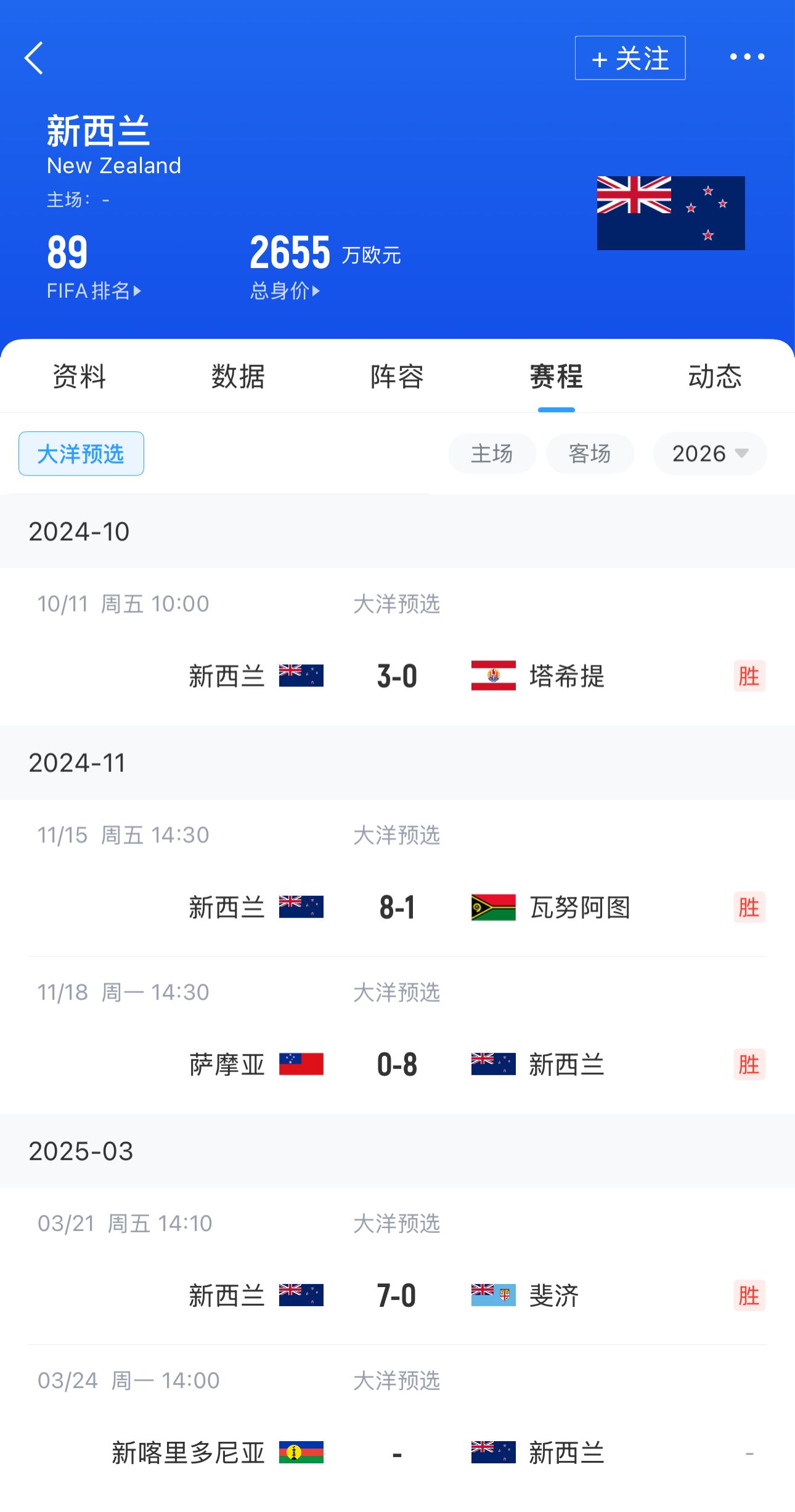 新西蘭FIFA排名第89,只比國足高1位,陣容身價2655萬歐,本屆預(yù)選賽至今4場打進(jìn)26球只丟1球。