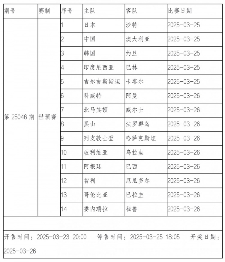 傳足勝負(fù)彩第25046期競猜賽事為亞洲區(qū)、歐洲區(qū)和南美區(qū)的世界杯預(yù)選賽。本期,亞洲區(qū)中國、日本和韓國東亞三強(qiáng)將分別在主場對(duì)陣澳大利亞、沙特和約旦,南美區(qū)則迎來阿根廷VS巴西的重頭戲。