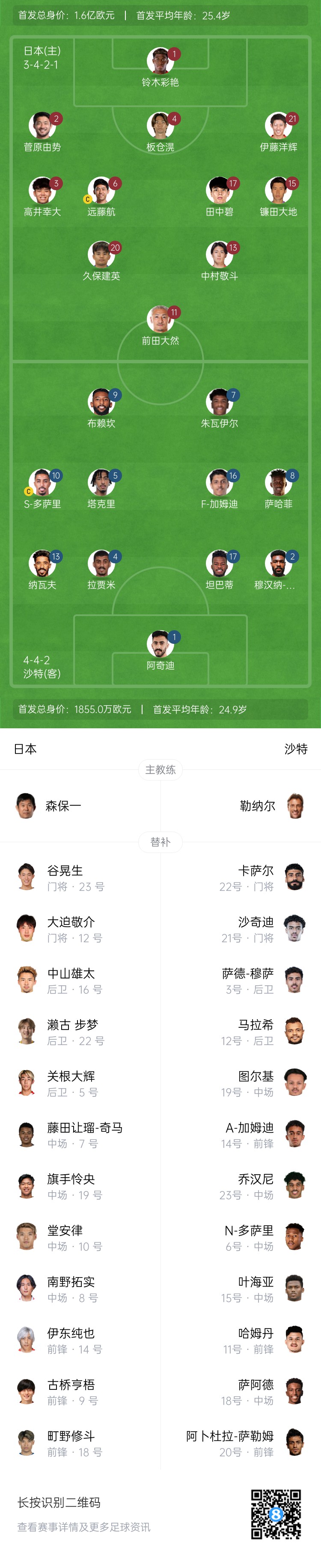 03月25日訊 北京時間18點35分,世預(yù)賽亞洲區(qū)第三階段C組第8輪,日本vs沙特,賽前雙方首發(fā)公布!日本已經(jīng)提前鎖定2025年世界杯席位,本場比賽他們對首發(fā)進行了輪換。