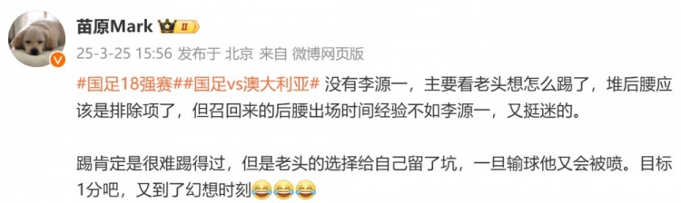 3月25日訊 國足今晚將在世預(yù)賽杭州主場對(duì)陣澳大利亞,媒體人苗原發(fā)文談到對(duì)國足陣容的看法。