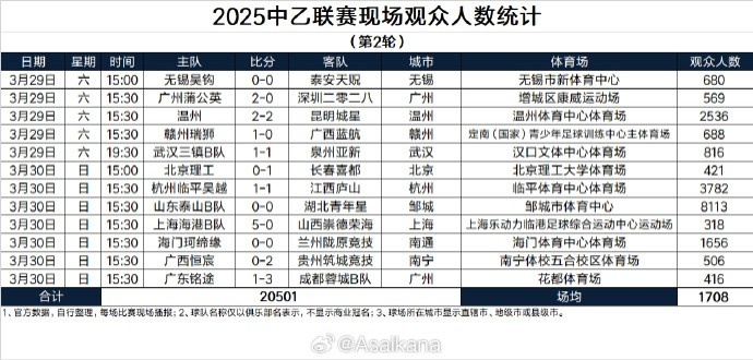 中乙第2輪現(xiàn)場(chǎng)觀眾:四場(chǎng)超千人,泰山B隊(duì)主場(chǎng)8113人最多