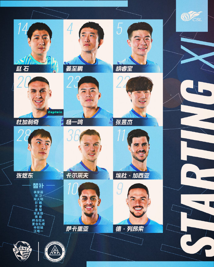 青島海牛替補(bǔ):1-劉君、2-肖鯤、5-沙一博、8-林創(chuàng)益、10-馮伯元、12-陳純新、24-胡靖航、27-鄭龍、31-羅森文、33-劉佳燊、34-金永浩、37-韋所為