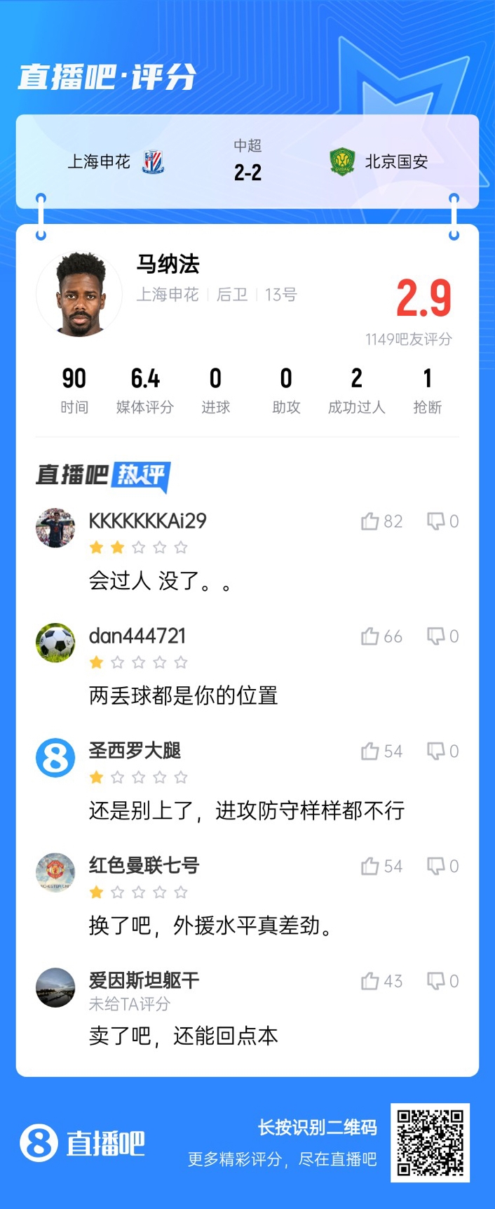 昨晚的京滬德比中,申花右后衛(wèi)馬納法與兩粒丟球都有關(guān)系。補(bǔ)時(shí)階段沒(méi)能防住李磊,后者強(qiáng)行起球助攻阿布雷烏完成絕平。