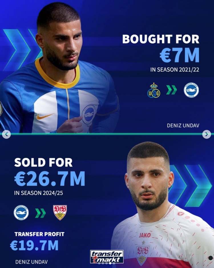 德轉(zhuǎn)列布萊頓近年5筆低買高賣,凈賺超2億歐:凱塞多&庫(kù)庫(kù)在列