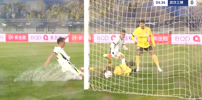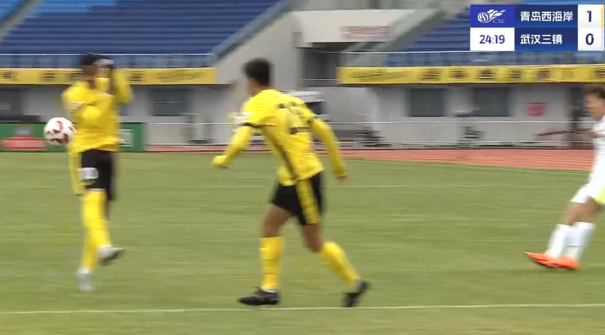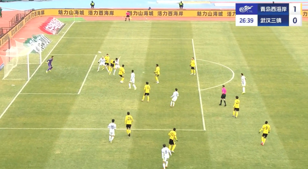 上半場補(bǔ)時(shí)3分鐘,青島西海岸1-0武漢三鎮(zhèn)。