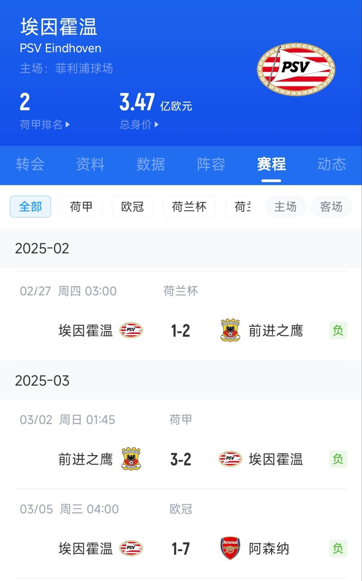 03月05日訊 歐冠16強(qiáng)比賽首回合,埃因霍溫在主場1-7被阿森納爆捶。短短一周的時(shí)間,埃因霍溫仿佛做噩夢一般。