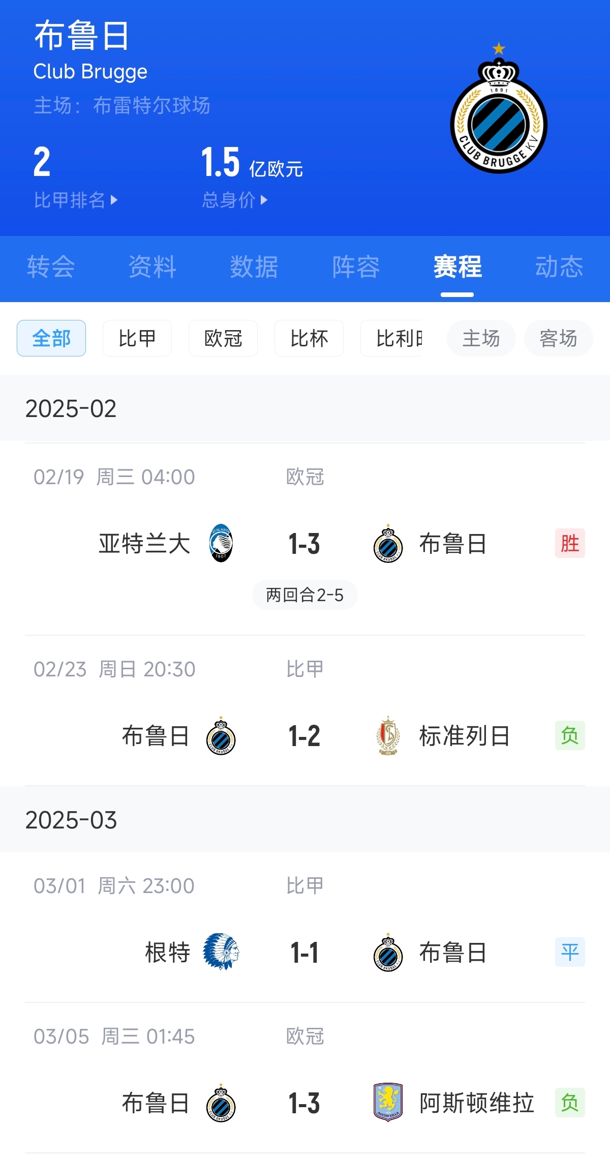 2月23日比甲布魯日1-2不敵標(biāo)準(zhǔn)列日,3月1日比甲布魯日1-1戰(zhàn)平根特,距離榜首亨克9分。3月5日凌晨,布魯日1-3不敵阿斯頓維拉。