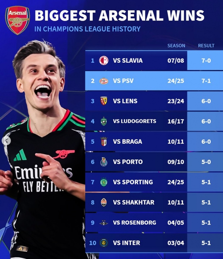 德轉(zhuǎn)列阿森納隊(duì)史歐冠大勝榜:7-0布拉格斯拉維亞、5-1國(guó)米