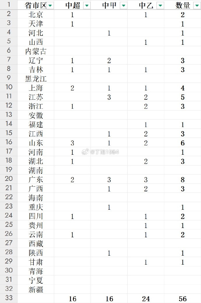 山東省擁有6支職業(yè)球隊(山東泰山、青島西海岸、青島海牛、青島紅獅、山東泰山B隊、泰安天貺)排名第二,江蘇省5支(南通支云、蘇州東吳、南京城市、無錫吳鉤、海門珂締緣)排在第三位。內蒙古、黑龍江、安徽、湖南、海南、西藏、青海、寧夏、新疆沒有職業(yè)聯(lián)賽球隊。