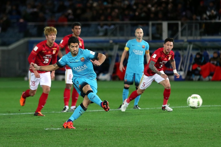 2015年世俱杯半決賽,蘇亞雷斯帽子戲法,巴薩3-0廣州恒大。